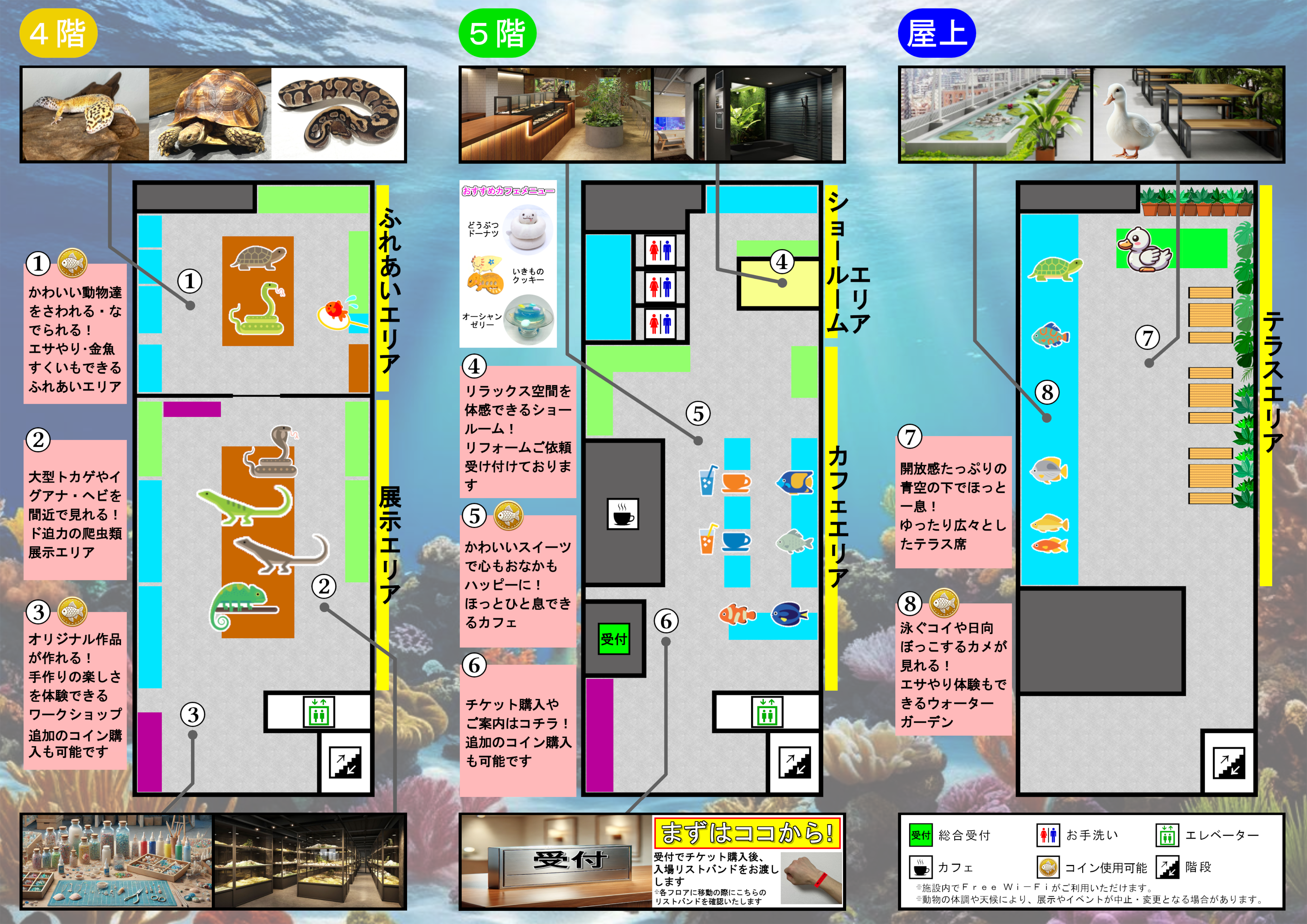 ・ふれあいコーナーやえさやり体験などで別途費用(コイン購入)必要あり